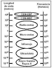Fig. 1. Tipos de radiación, ordenados según su longitud de onda. CEM: Campos ElectroMagnéticos; EBF: Extraordinariamente Baja Frecuencia; MBF: Muy Baja Frecuencia.