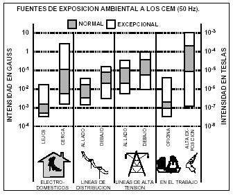 Fig. 2. Exposición a los campos electromagnéticos en distintos ambientes. Según datos de Leonard et al., Electric and Magnetic Fields: Measurements and Possible Effects on Human Health. Special Epidemiological Studies Program, California Department of Health Services, 1990