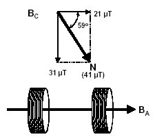 Fig. 3. Orientación del campo magnético terrestre en Valladolid. Se muestra el ángulo con el horizonte y las componentes horizontal y vertical, en microTeslas. Debajo, un CEM generado por dos bobinas de inducción (BA). La frecuencia de resonancia de ciclotrón (Fz) para un determinado ion de carga q y masa m puede calcularse de la siguiente fórmula: Fz = (1/2) · p · (q/m ) · Bc.