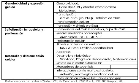 A continuación se revisan los principales aspectos sobre los que se han centrado los estudios experimentales, que pueden agruparse en tres grandes apartados (Tabla 1): Genotoxicidad y expresión génica, señalización y proliferación y desarrollo y diferenciación.