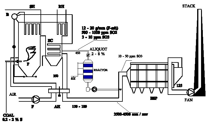 – El [SO3] generado en el hogar será variable, pero en la mayoría de las CTC está entre valores de 0,6 a 0,9 % del SO2 formado a partir del azufre del combustible de partida.