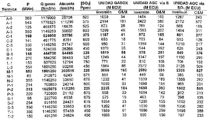 Los costes asociados a la implantación de la unidad GASOX en una CT determinada pueden estimarse utilizando los datos disponibles sobre dos unidades de demostración diseñadas por el DIQA (50.000 Nm3/h (550 Mwe) y 30.000 Nm3/h (220 Mwe) respectivamente.