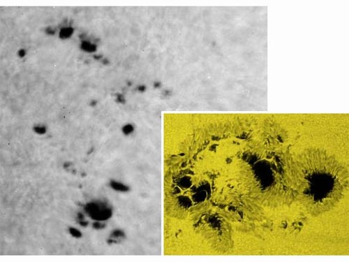 ![]() Raquíticas. Sin la penumbra (como puede verse en la foto en amarillo) las manchas de sol actuales son magnéticamente raquíticas |