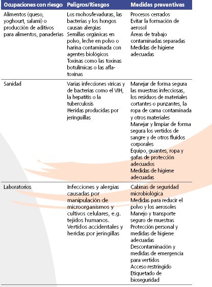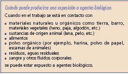 Los mohos/levaduras, las bacterias y los hongos causan alergias Semillas orgánicas en polvo, leche en polvo o harina contaminada con agentes biológicos Toxinas como las toxinas botulímicas o las aflatoxinas Varias infecciones víricas y de bacterias como el VIH, a hepatitis o la tuberculosis .Heridas producidas por jeringuillas .Infecciones y alergias causadas por manipulación de microorganismos y cultivos celulares, e.g. tejidos humanos. Vertidos accidentales y heridas por jeringillas