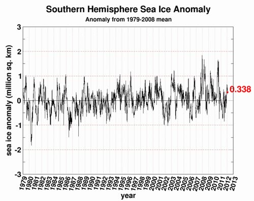 Steven Goddard nos dice que las temperaturas de la Antártida están ahora 10 grados Celsius por debajo lo normal (mapa animado) de modo que parece que el Efecto Gore también está funcionando muy bien allá abajo. Sólo para recordarle: el Hemisferio Sur está en verano en estos momentos. Sin embargo, la temperatura promedio de la Antártida no sobrepasa el punto de congelamiento en ningún mes. La temperatura más baja jamás registrada en la superficie ocurrió allá, por supuesto, y fue de -89,2ºC.