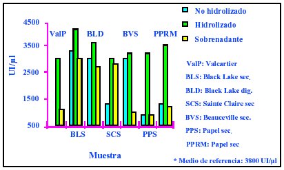 Los lodos no hidrolizados BLS y BLD muestran las menores cuentas totales (BLS=1.3E+06 y BLD=1.1 E+06 UFC/mL) y de esporas (1.06E+06 para ambos), mientras que el lodo BVS indica el valor mas elevado para la cuenta total (1.4E+07 UFC/mL) y de esporas (1.3E+07 UFC/mL). En general, puede decirse que los lodos hidrolizados permitieron un mejor crecimiento de la bacteria, en comparación con los resultados obtenidos con las muestras no hidrolizadas y los sobrenadantes. Es importante señalar que después de la hidrólisis, el lodo ValP permitió el desarrollo y esporulación de Btk.