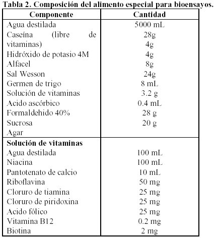Se empleó la técnica de incorporación de la preparación en un alimento artificial 22 específico para este tipo de pruebas, cuya composición se muestra en la Tabla 2. Se adicionaron 1 ìL, 2 ìL y 3 ìL de la muestra en la superficie del alimento el cual estaba contenido en viales. Se emplearon 20 viales por cada volumen de muestra y como blanco se utilizaron 50 viales en los que se distribuyó 1 ìL de agua destilada.