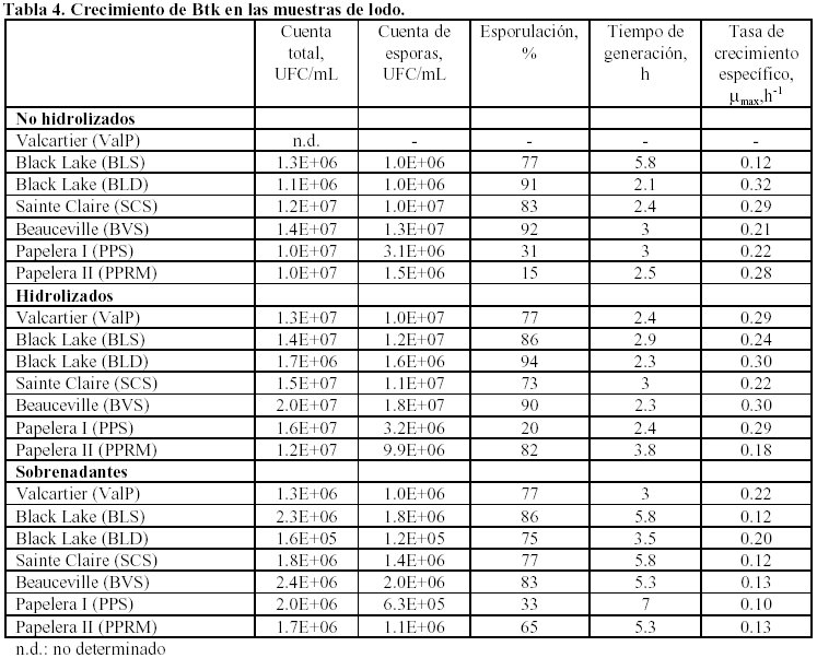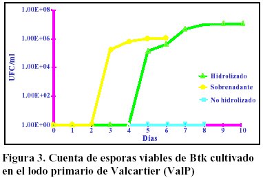 En el lodo primario de Valcartier (ValP) Btk presentó un comportamiento diferente al presentado en las otras muestras de lodo. En el lodo sin hidrólisis química no hubo crecimiento, por lo cual no se reportan datos de esporulación. La esporulación se inició hasta el tercer día en el sobrenadante, mientras que en el lodo hidrolizado se inició al quinto día.