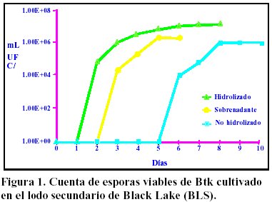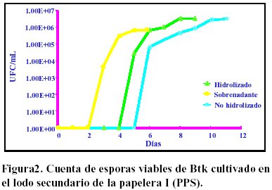 Las Figuras 1,2 y 3 muestran el desarrollo de Btk desde el inicio del experimento hasta la total esporulación en los lodos mas representativos (BLS, PPS y ValP). La Figura 1 indica que el rendimiento en cuanto a esporas viables fue superior cuando el lodo de Black Lake se hidrolizó, con respecto a los resultados obtenidos con el sobrenadante y el lodo no hidrolizado. El tiempo para alcanzar la esporulación total fue mayor al emplear el lodo no hidrolizado. En este sustrato, la esporulación se inició hasta el sexto día, mientras que en la muestra hidrolizada y en el sobrenadante se presentó al segundo y tercer día, respectivamente.