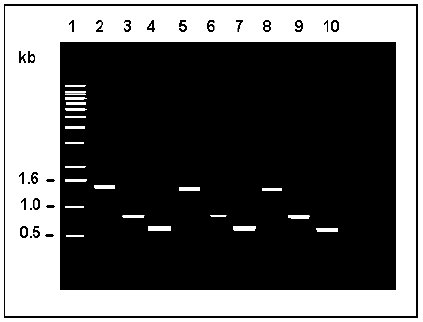 La Figura 4 muestra los resultados de la electroforesis realizada empleando el ADN amplificado de Btk obtenido al emplear el lodo de Beauceville hidrolizado como medio de cultivo. El carril 1 contiene el marcador de peso molecular 1kb, los carriles 2, 3 y 4 son los controles positivos que contienen el ADN amplificado de Btk cultivado en un medio sintético. Los carriles 5, 6 y 7 muestran los productos de amplificación del ADN de esta bacteria obtenido empleando el lodo mencionado, correspondiente al tercer día de cultivo y en los carriles 8, 9 y 10 las amplificaciones correspondientes a los productos del último día de cultivo en el lodo. Los resultados de los carriles 5, 6, 7, 8, 9 y 10 indican productos de amplificación de ADN de la misma longitud que los obtenidos al emplear el medio sintético para cultivar Btk.