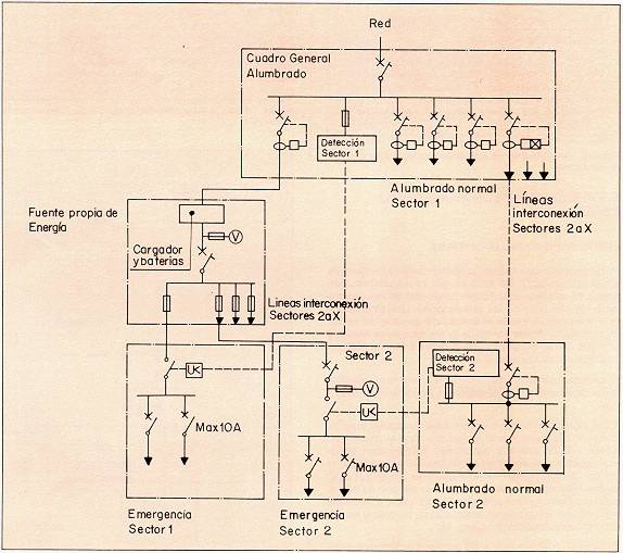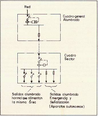 Por lo general estos aparatos deberán conectarse siempre sobre la instalación del área en que se encuentran, con objeto de que respondan tanto para fallos de red como a disparos parciales de las protecciones. Únicamente podrán alimentarse desde el embarrado general del sector cuando el alumbrado normal de su misma área se alimente con dos o más circuitos y que el fallo de uno de ellos no implique zonas oscuras. (Fig. 7).