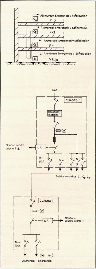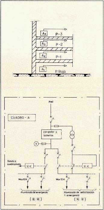 Fig. 11: Sistema centralizado con baterías. Alumbrados de emergencia y señalización más emergencia. Un equipo por planta