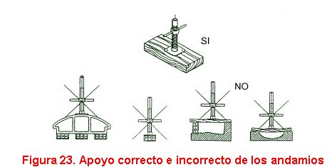 Los andamios deben montarse sobre una superficie plana y compactada o en su defecto sobre tablas, tablones planos de reparto o durmientes y debe estar claveteado en la base de apoyo del andamio. No se debe permitir el apoyo sobre ladrillos, bovedillas, etc.;. (Fig. 23)