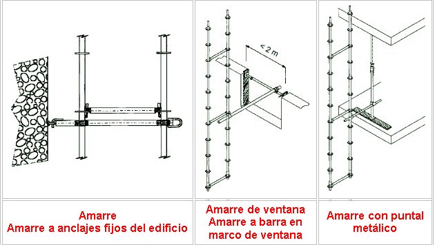 Los amarres del andamio a la fachada deben realizarse cuando la estructura alcance el nivel de amarre previsto en el proyecto. La disposición y el número de amarres deben estar definidos en el plano de montaje. Deben ser capaces de soportar las cargas horizontales, tanto perpendiculares como paralelas a la fachada, es decir, el amarre traslada al anclaje situado en la fachada todas las acciones horizontales que la estructura soporta. Como pautas a seguir se aconseja instalar un amarre cada 24 m 2 cuando hay red y cada 12 m 2 cuando no hay red.
