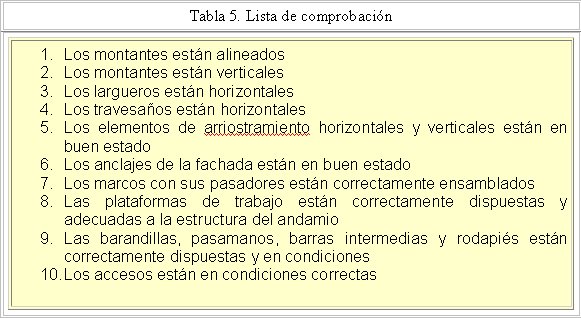Los andamios deben inspeccionarse antes de iniciar la jornada laboral o después de verse afectado por cualquier inclemencia atmosférica, en especial el viento. En la Tabla 5 se indica una lista de comprobación que facilita dicha inspección.