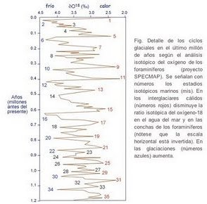El siguiente gráfico presenta el detalle de los ciclos glaciales del último millón de años, del que se concluye que antes de la actual bonanza interglacial en la que vivimos, hubo al menos cuatro en las que las temperaturas fueron notablemente más altas que las de ahora.