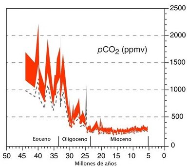 Y también del mismo Uriarte tomo el siguiente gráfico que ilustra cómo el CO2 atmosférico en realidad viene de baja en los últimos 50 millones de años. “Recién” hace 30 millones de años se cayó por bajo la barrera de las 500 ppm(v), y desde entones se mantiene en un equilibrio dinámico.