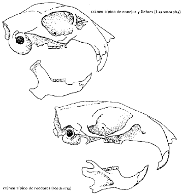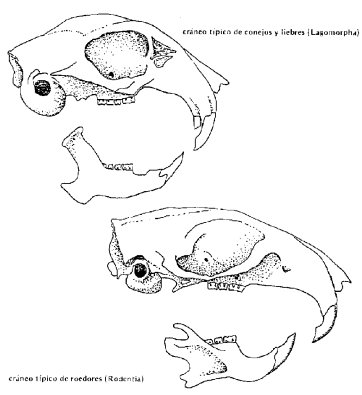 Figura 2. Los roedores toman su nombre del latín “rodere” roer. El nombre indica la característica que distingue a los roedores de los demás mamíferos, la forma y ubicación de sus dientes. La única disposición dental similar se encuentra en los miembros de la Orden Lagomorpha (conejos y liebres) pero estos animales tienen dos incisivos adicionales en Ia mandíbula superior .