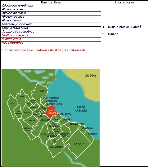 La Provincia de Buenos Aires es atravesada por una de las ecorregiones más grandes, Pampa , y Delta e Islas del Paraná , las cuales son ricas en rodentofauna, a saber: