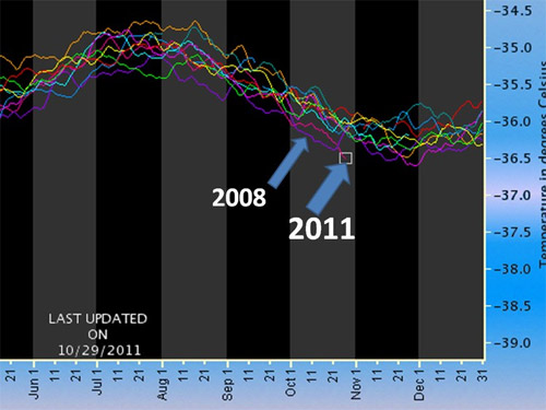 Para quienes llevan el registro de las actualizaciones de la temperatura en el sitio web Discover, quizás haya notado la caída constante de las temperaturas globales de este mes. Los canales AMSU de la troposfera media están mostrando temperaturas más frías que las que teníamos en esta fecha en la última La Niña de 2008. La siguiente captura de pantalla es del canal 6 de AMSU: