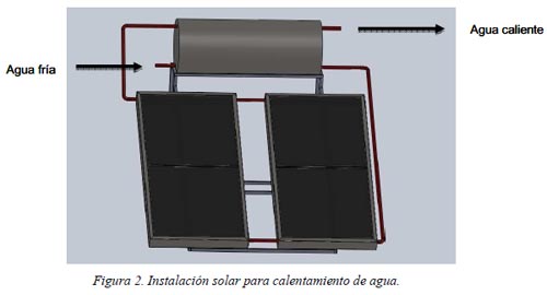 La instalación solar a estudiar tiene dos colectores solares planos de 2 m2 de área bruta cada uno, y un tanque de almacenamiento de 215 L. Los colectores solares se posicionan con 30º de inclinación, mirando al norte (Figura 2). El consumo de agua caliente de la instalación se fija en 240 L diarios, a 45 ºC de temperatura, y se considera la temperatura del agua fría igual a 18 ºC.