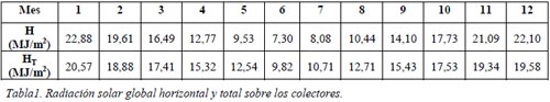 En la Tabla 1 se muestran los valores de la radiación solar global promedio mensual, medidos en el plano horizontal (H) y resultantes del cálculo sobre los colectores solares planos (HT). Se observa que el posicionamiento de los colectores logra acrecentar la radiación solar recibida en otoño e invierno. Asimismo la radiación incidente en todo el año, es mayor sobre el plano inclinado de los colectores que sobre uno horizontal (Albizzati, 1997; Albizzati, Rossetti y Alfano, 1997).
