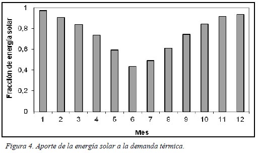 La fracción de la demanda térmica cubierta con energía solar varía mes a mes (Figura 4). Como es esperable, los aportes máximos son en el verano y mínimos en invierno, llegando al 97 % y 43 % respectivamente.