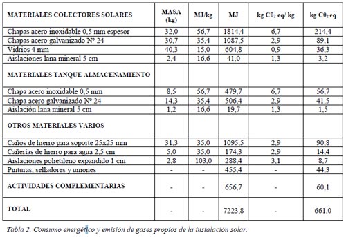El resultado de la valoración del consumo energético y la emisión de gases equivalentes a dióxido de carbono para la instalación solar, se resume en la Tabla 2. Como es sabido, para la construcción de los colectores solares se utilizan diversos materiales y variados diseños. En este caso, en relación con los componentes más importantes, el conjunto placa absorbenteconductos de fluido es de acero inoxidable, la cubierta semitransparente es de vidrio común y el aislante es lana mineral.
