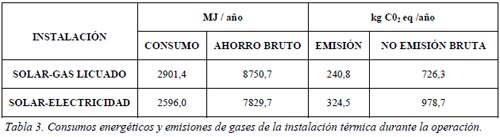 Al determinar el ahorro neto en la instalación térmica se consideran los efectos asociados a los consumos energéticos y a las emisiones de gases en todo el ciclo de vida, abarcándose los correspondientes a la instalación solar propiamente dicha (Tabla 2) y a su funcionamiento (Tabla 3).