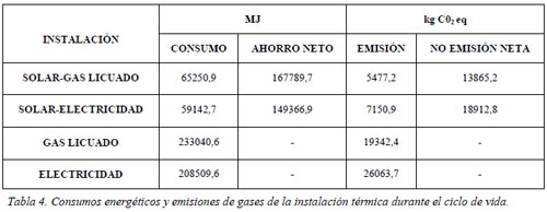 Según lo volcado en la Tabla 3, y considerando el área neta del colector solar, el ahorro energético bruto es 2431 MJ / año m2 y la emisión bruta evitada es igual a 202 kg C02 eq /año m2, para la instalación solar-gas licuado. En la instalación solarelectricidad, el ahorro bruto es 2175 MJ / año m2 y la no emisión bruta es 272 kg C02 eq / año m2.