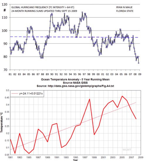 Frecuencia de huracanes globales versus temperaturas de los océanos. La imagen superior de FSU ACE, la imagen inferior de datos oceánicos de GISS ploteados por WUWT.