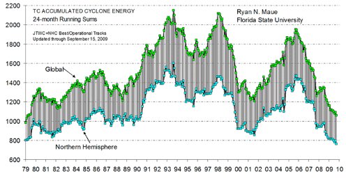 Usando una métrica bien aceptada llamada el Índice de Energía Ciclónica Acumulada (o ACE, por sus siglas en inglés –Bell y Short, 2006), que ha sido usada por Klotzbach (2006) y Emanuel (2005) [PDI es análogo a ACE], y más recientemente por yo mismo en Maue (2009), un simple análisis muestra que las sumas de 24 meses corridos del ACE global o energía de los huracanes se ha desplomado a niveles no vistos desde los años 70.