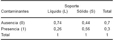En la Tabla 1, se observa que la proporción de inoculantes que no presentó contaminantes fue del 74% al considerar los inoculantes líquidos acuosos y del 44% al considerar los de soporte sólido. La prueba Chi cuadrado indicó dependencia entre las variables tipo de soporte y presencia o ausencia de contaminantes (p ≤ 0,0129).