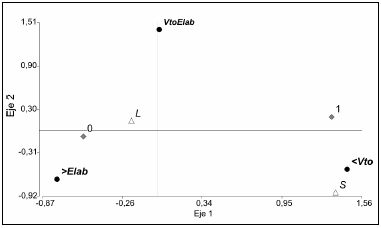 ![]() Figura 1. Biplot de análisis de correspondencias entre las variables: Categorías de recuentos: (> Elab) mayor que lo que establece la ley como mínimo a la fecha de elaboración; (VtoElab) entre los valores establecidos por ley como mínimos a la fecha del vencimiento y a la de la elaboración; (< Vto) menor a lo establecido por ley como mínimo para la fecha de vencimiento. Tipo de soporte: (L) líquido; (S) sólido. Contaminantes en el inoculante: (0) ausencia; (1) presencia. |