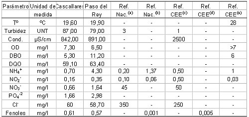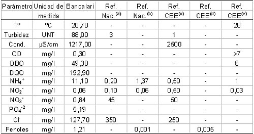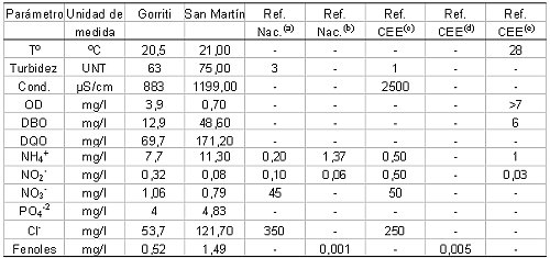 La Tabla 1 resumen la calidad del agua superficial de la Cuenca y los estándares de calidad aconsejados a nivel nacional e internacional.