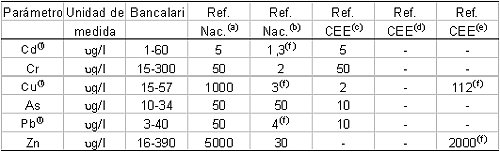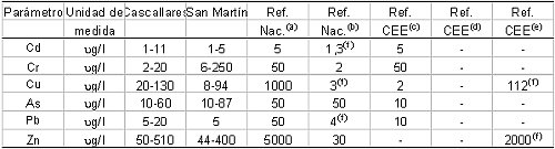 Tabla 2. Concentración de metales pesados en agua en la cuenca del río Reconquista para el año 1994 y estándares de calidad. Fuente: modificado de Castañé et al. (1998) (a) Valores de referencia de la Ley Nacional Nº 18,284, Código Alimentario Argentino. Tabla 2 (continuación).