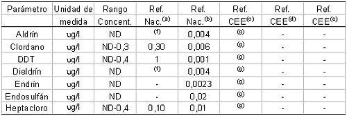 Los pesticidas organoclorados (como aldrín, clordano, diclo-difenil-tricloroetano y sus derivados, dieldrín, endrín y heptacloro, entre otros) y los organofosforados (como diazinón, disulfutón, endosulfán, etión, forato, metilparatión, malatión, paratión y ronnel, entre otros) presentan una baja biodegradabilidad y son altamente tóxicos para los organismos vivos. Por esta razón, los compuestos organoclorados se encuentran prohibidos en Argentina desde 1970. Un estudio realizado por Rovedatti et al. (2001), mostró que la concentración de algunos pesticidas organoclorados es entre 40 y 400 veces superior al valor máximo establecido por la legislación nacional para la protección de la vida acuática (Tabla 3). Sin embargo, no se detectaron insectividas organofosforados, probablemente, como consecuencia de su baja vida media en agua.