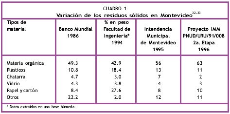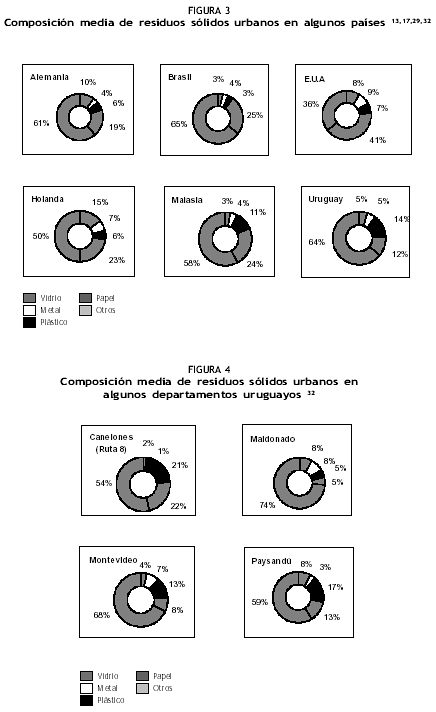 A modo de ejemplo, las Figuras 3 y 4 muestran la composición física media de los residuos sólidos domiciliaria de algunos países y de varias regiones de Uruguay.