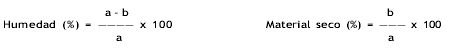 Luego de pesada la muestra, se seca en la estufa entre 100 y 130°C, hasta que se consiga un peso constante. La humedad y el material seco se determinan mediante las siguientes ecuaciones: