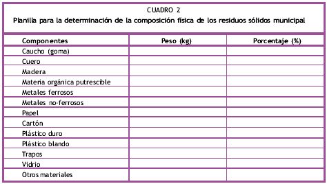 La composición física de los residuos sólidos será obtenida mediante el análisis de la Muestra 3, a través de la clasificación de la muestra, separándose los materiales componentes según lo que se indica en el Cuadro 2.