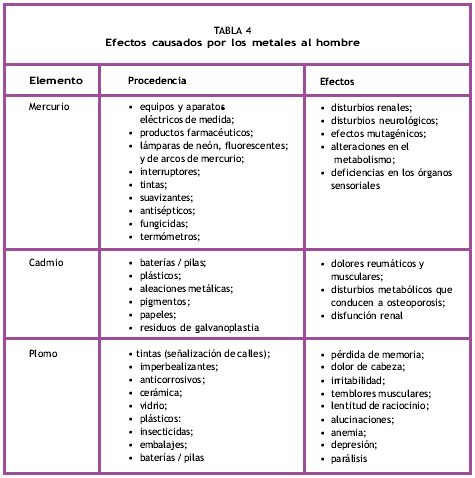 La Tabla 4 ilustra los efectos causados en el hombre por algunos metales, y de dónde proceden los mismos.
