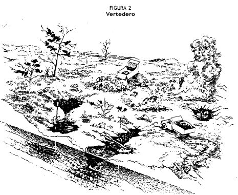 Un vertedero es una forma de disposición final de los residuos sólidos, que se caracteriza por la simple descarga (vertido) de los residuos sobre el terreno, sin medidas de protección para el medio ambiente o la salud pública. Es lo mismo que la descarga de residuos a cielo abierto3. (Figura 2)