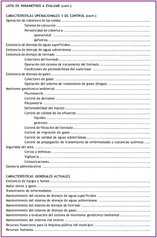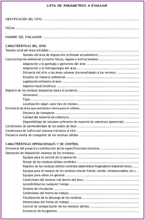 Para ayudar en la calificación del área de disposición, principalmente para áreas ya en servicio, se puede aplicar un modelo de cuestionario o check-list para evaluar los principales problemas que ocurren.