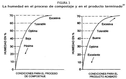 Humedad – el nivel de humedad de los residuos depende de su granulometría, porosidad y grado de compactación. Para un buen compostaje, la humedad debe mantenerse alrededor de un 50%. Si fuese muy baja, se reduciría la actividad biológica; si fuese muy elevada, se perjudicaría la aeración, y se produciría una anaerobiosis. En tales condiciones, se forma lixiviado, líquido de color oscuro y nauseabundo, que sale de las pilas del material en descomposición. Su producción es más elevada cuando las pilas de residuos sólidos mojados son muy altas, compactando y exprimiendo las capas inferiores de residuos.