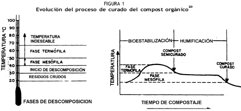 Temperatura – el proceso comienza a temperatura ambiente, pero a medida que la acción microbiana se intensifica, con la aeración apropiada, la temperatura se eleva hasta alcanzar valores superiores a 55-60 ºC, en los que se mantiene por un período de tiempo que depende de las características de los residuos y de la operación de la planta. Esa fase, denominada termófila, es importante para la eliminación de microbios patógenos y semillas de hierbas dañinas, eventualmente presentes en el material. Le sigue una fase con disminución de la temperatura hasta niveles de 30-35 ºC a 45-50 ºC, donde se da la bioestabilización de la materia orgánica (relación C/N próxima a 18), y finalmente, la humificación en la cual la relación C/N puede bajar a niveles inferiores a 12, con temperaturas mesófilas.