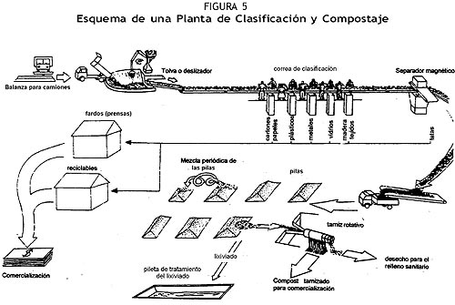 Las instalaciones de una planta de compostaje pueden agruparse en cinco sectores: recepción y despacho, unidad de clasificación, patio de compostaje, acondicionamiento y almacenamiento del compost, y entierro de desechos. La denominación de planta de clasificación y compostaje se debe a que abarca los dos procesos. La Figura 5 presenta una vista general de las instalaciones de esa planta.