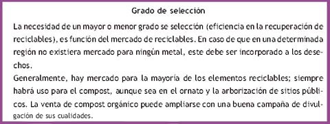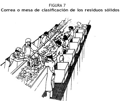 Este es el local donde se hace la separación de los residuos en los diversos componentes. El equipo principal es la correa de selección (Figura 7), de goma y con poleas en las extremidades, que se desliza sobre rodetes, desplazando los residuos sólidos desde un extremo al otro, permitiendo así el retiro de los materiales reciclables. Esos elementos se echan a carritos o vagonetas de ruedas, y luego se llevan al depósito de reciclables. Para poder retirar el máximo posible de metales, inclusive baterías, pilas eléctricas y tapas de botellas y frascos, la correa debe estar provista de un separador magnético, que puede constar de un electroimán o de una polea magnética dentro de la propia correa.