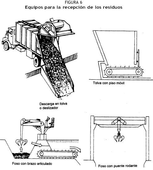 Patio de recepción – para descargar los residuos sólidos, los camiones recolectores necesitan de un patio para maniobras y descarga. Ese patio funciona también como «pulmón », y recibe la descarga de los residuos sólidos en caso de interrupción temporal del funcionamiento de la planta. Reiniciado el funcionamiento, los residuos del patio serán llevados al foso o a la tolva;