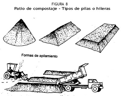 En la mayoría de los casos, la fracción orgánica de los residuos sólidos se dispone en pilas o hileras de geometría variable, que se voltean periódicamente hasta obtener la cura del compost (Figura 8).