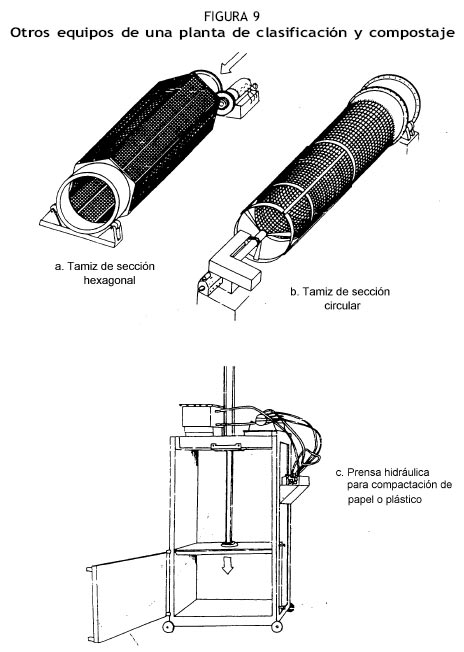 Prensas compactadoras – son equipos hidráulicos o manuales destinados a reducir, mediante presión, el volumen de materiales reciclables, como latas, plásticos, papel, cartón. (Figura 9 -C).